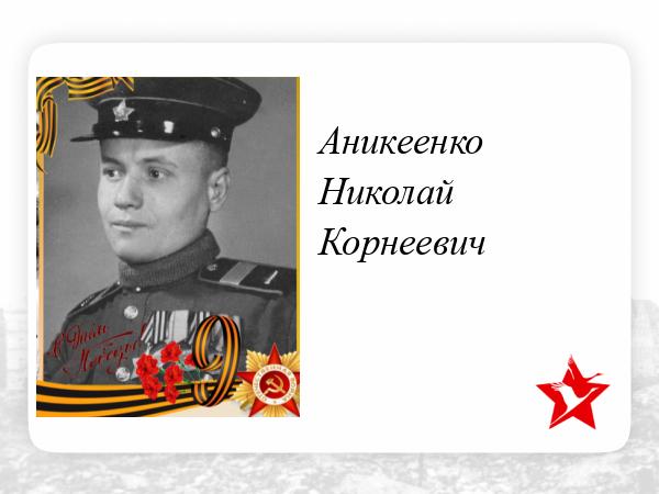 Мой дед Аникеенко Николай Корнеевич родился 2 июня 1925 года в Новосибирской области Кочковский р-он с.Быструха, был призван на фронт 1 ноября 1942 года. Воевал механиком водителем ср.танков Т-34: Воронежский Фронт 39 танковый полк, 1Украинский Фронт 175 Танковая бригада, был тяжело ранен, отголоски этого ранения дошли и до наших дней, осколок под сердцем оборвал его жизнь в 1986 году. Награжден: Орден "Славы III степени", медали "За Отвагу", "За взятие Берлина", "За победу над Германией"Орден "Отечественной войны I степени". Медали по дороге домой с фронта были украдены и по наградным книжкам потом была сделана орденская планка, которую мы и помним у него на костюме. Домой он вернулся в 1950 году.