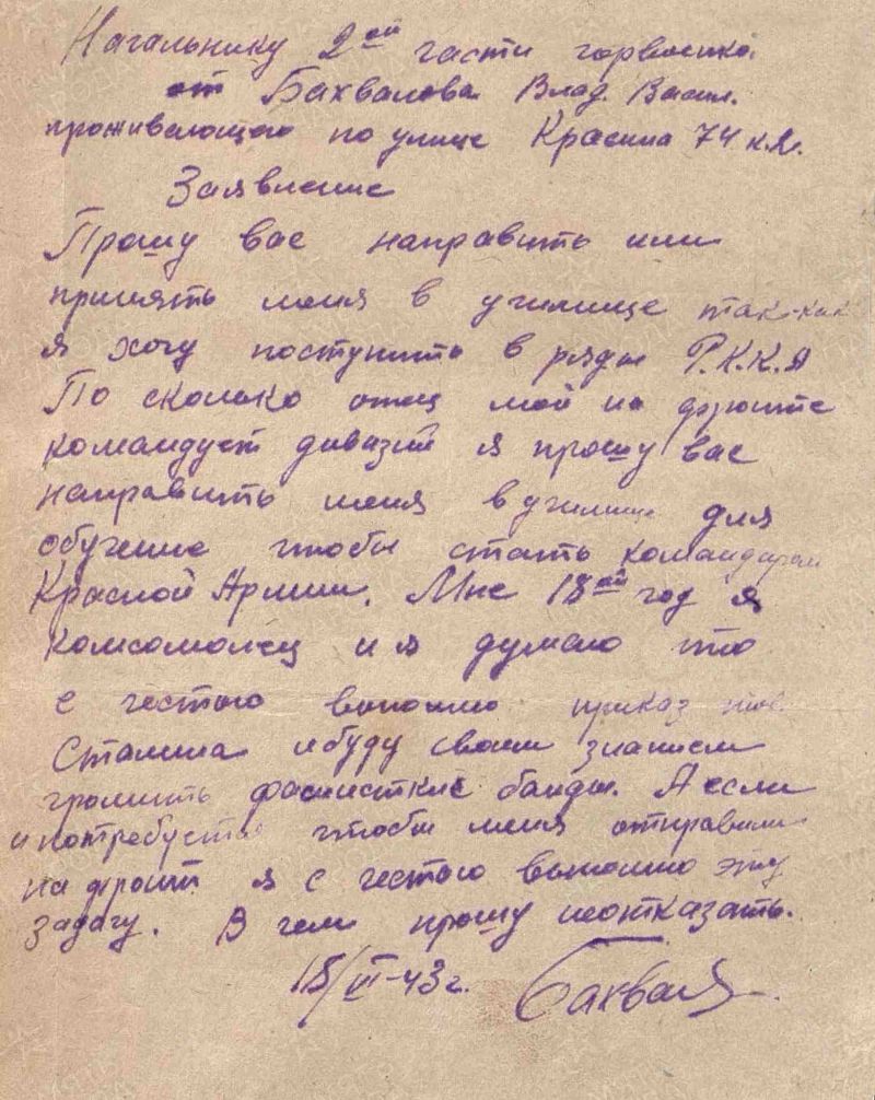 23 июня 1943г. направлен Ленинским райвоенкоматом Уфы на Республиканский сборный пункт, как кандидат для поступления в морское военное авиационное училище в г.Сарапул располагалась 3 школа пилотов первоначального обучения ВВС ВМФ).