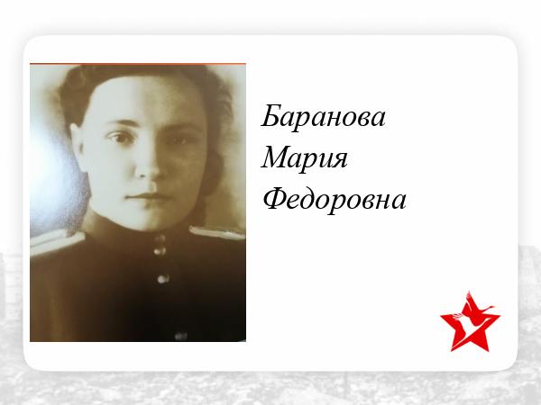 «... Мл. техник-лейтенант тов. БАРАНОВА Мария Федоровна в период прорыва обороны немцев и наступательных операций фронт а работала дежурным техником коммут атора ВЧ станции в районе Высоты 208, Н. Село, Новохресты, Ми нск, Зарудичи. в районе Высоты 208 ВЧ станция находилась в непосредственной близости к переднему краю обороны и часто подвергалась артиллерийскому обстрелу