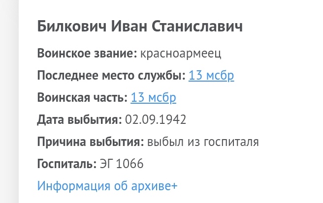 Белкович Иван Станиславович, 1905 г. р. Место рождения Красноярский край, Сухобузимский район, с. Абакшино. До войны жил в Удерейском районе, с. Мотыгино. Призван Удерейским РВК в 1941 году. Красноармеец. Пулемётчик. В/ч 132 гв. сп 42 гв. сд., 13 мсбр. Ранен в сентябре 1942 года. ЭГ 1066 (по справочнику Солдат. ру дислокация г. Тула), ЭГ 1379, Владимирская область. Выбыл из госпиталя в сентябре 1942 года. Документов о дальнейшей судьбе на сайте Память народа нет. Жена Белкович Е. И.