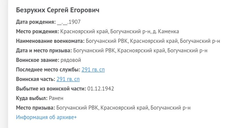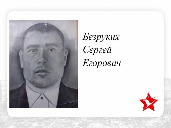 Безруких Сергей Егорович, 1907 г. р. Место рождения Красноярский край, Богучанский район, д. Каменка. Призван Богучанским РВК в августе 1942 года. Красноармеец. Стрелок. В/ч 291 гв. сп 96 гв. сд., 367 сп 71 сд. Ранен 1.12.1942 года. Убит в бою 2.10.1943 года. Похоронен Украина. Харьковская область, Дарницкий район, с. Осокорки. Жена Безруких Ирина Игнатьевна.