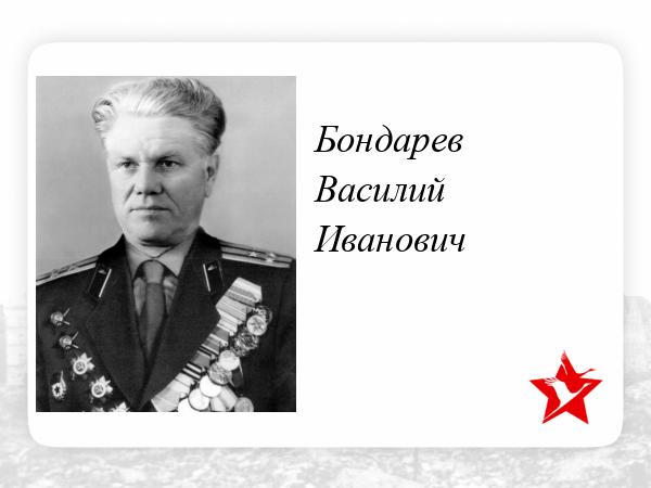 Гвардии полковник Бондарев Василий Иванович родился 25 марта 1911 г. в казачьей слободе Калач Богучарского уезда Воронежской губернии. В 1922 году в возрасте 11 лет Василий пошел работать, как сам писал в автобиографии – «пастухом общинного скота», параллельно учился в начальной школе. С 1926 по 1929 год работал разнорабочим у частных подрядчиков. В 1929 г. вступил колхозником во вновь образованный колхоз имени ОГПУ. В 1930 г. он был призван на службу в Рабоче-Крестьянскую Красную армию. С 15 сентября 1930 по июль 1931 г. был курсантом военно-технической школы при 2-й авиабригаде в городе Витебске. В это время комиссаром авиабригады был будущий прославленный летчик дважды Герой Советского Союза, генерал-лейтенант Я.В.Смушкевич. После окончания школы ему было присвоено звание младшего командира, и он получил назначение на должность оружейного мастера 22-й эскадрильи в город Оршу. В октябре 1932 г. В.И.Бондарев остался на сверхсрочную службу и перевелся в Дальневосточный военный округ на должность оружейного техника 23-й авиаэскадрильи 7-й авиабригады. 24.12.34. после более чем четырех лет службы увольняется в запас и возвращается на родину. С декабря 1934 г. по август 1935 г. Василий Бондарев работал уполномоченным воронежского областного радиокомитета при Калачевском райкоме ВКП (б). В 1935 – 1938 гг. был студентом Воронежского коммунистического ВУЗа, там, в январе 1938 г. вступил в ВКП(б), партбилет № 2040763.