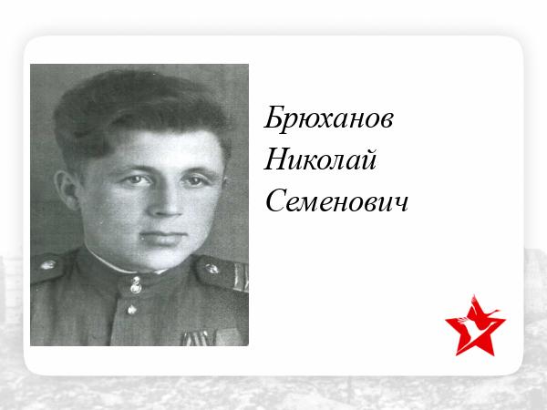 Брюханов Николай Семёнович, 1924 г. р. Место рождения Красноярский край, Богучанский район, д. Карабула. Призван Богучанским РВК в 1942 году. Ефрейтор. Артиллерист. В/ч 2 УкрФ. Награждён медалью За Победу над Германией в Великой Отечественной войне 1941-1945 гг.