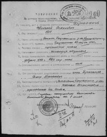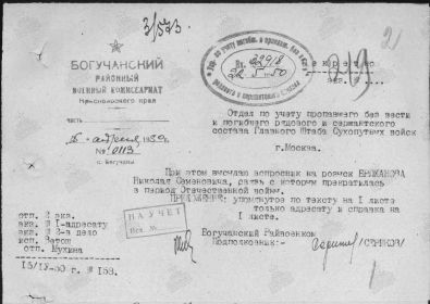 Брюханов Николай Семёнович, 1917 г. р. Место рождения Красноярский край, Богучанский район, д. Заимка. Призван Богучанским РВК в 1941 году. Сержант. Командир отделения. В/ч 290 сп 186 сд. Последнее письмо родные получили в феврале 1942 года. Справку о нахождении Брюханова Н.С. в 290 сп написал Колпаков Иннокентий Петрович, однополчанец, в 1950 году. Признан пропавшим без вести в мае 1942 года на Смоленском направлении. Отец Брюханов Семен Михайлович в 1950 году проживал в д. Гольтявино Богучанского района.
