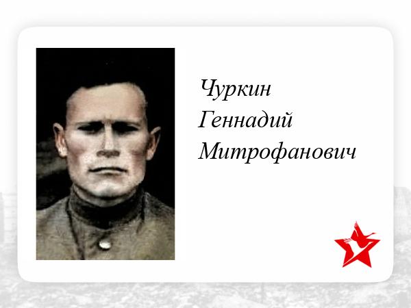 Приказом от 15 апреля 1945г. гвардии младший лейтенант Чуркин был награжден орденом Красной Звезды.