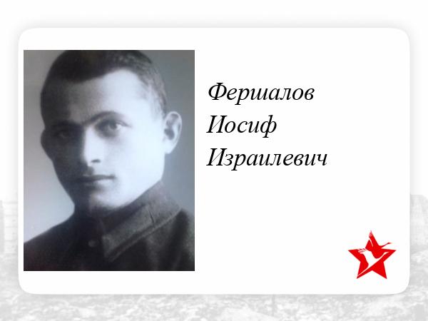 Младший политрук (лейтенант) ФЕРШАЛОВ ИОСИФ ИЗРАИЛЕВИЧ, 24.12.1916 года рождения, место рождения - РОССИЙСКАЯ ИМПЕРИЯ, Черниговская губерния, Новозыбковский уезд, уездный город Новозыбков (по административному делению: 1. СССР: РСФСР, Брянская область, Новозыбковский район, город Новозыбков; 2. РОССИИ: Брянская область, Новозыбковский район, г. Новозыбков), еврей. В РККА призван Новозыбковским РВК, г. Новозыбков, Брянской области, РСФСР, в 1938 году. Участник войн: 1. Советско - финской (1939 -1940 гг.); 2. Великой Отечественной, с 22.06.1941 года, в должности (последняя): Политрука стрелковой роты 91 стрелкового полка, 37 стрелковой Новочеркасской Краснознамённой дивизии имени А. И. Егорова, 19 армии, Западного фронта (07.1941). 07.1941, пленён: Белорусская ССР, Минская область, Дзержинский район, в районе города Дзержинск.В плену (назвал: 1. Имя: Аркадий; 2. Отчество: Ильич; 3. Национальность: русский; 4 Военно - учётную специальность: интендант 2 ранга): Oflag 62 (XIII D) Hammelburg, военный округ XIII – Нюрнберг (Nürnberg), Бавария (Bayern), Третий Рейх (Das Dritte Reich); в н. вр.: г. Хаммельбург (Hammelburg), район Бад-Киссинген (Bad Kissingen), административный округ Нижняя Франкония (Unterfranken), федеральная земля Бавария (Bayern), ФРГ (Bundesrepublik Deutschland ), идентификационный номер 145913 в "Базе данных о военнопленных" (Центр документации г. Дрезден, ФРГ). Выявлен, как еврей. 5.11.1941 года, передан гестапо. После 5.11.1941 года, расстрелян на учебном стрелковом полигоне школы снайперов СС, в качестве "живой мишени", ХЕБЕРТСХАУЗЕН (Hebertshausen), Бавария (Bayern), Третий Рейх (Das Dritte Reich). В "Списке солдат, сержантов, офицеров расстрелянных на учебном стрелковом полигоне школы снайперов СС Хебертсхаузен, в качестве "живых мишеней", предоставленный "Народным союзом Германии по уходу за военными захоронениями" газете "Комсомольная Правда" ( https://www.kp.ru/daily/26826.5/3864818/ ; Виктор МУХИН, Райнхард ОТТО), не включённых в ”СПИСОК МАРГАРИТЫ КОТИКОВСКОЙ", графа 10, порядковый №37. Родственники: РСФСР, Брянская область, Новозыбковский район, г. Новозыбков, жена - Курочкина Елена Андреевна.
