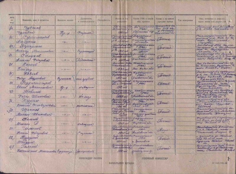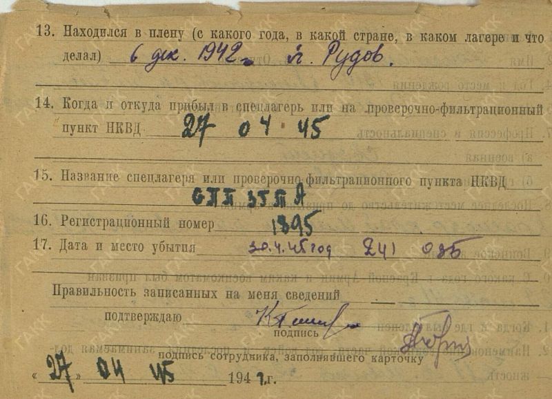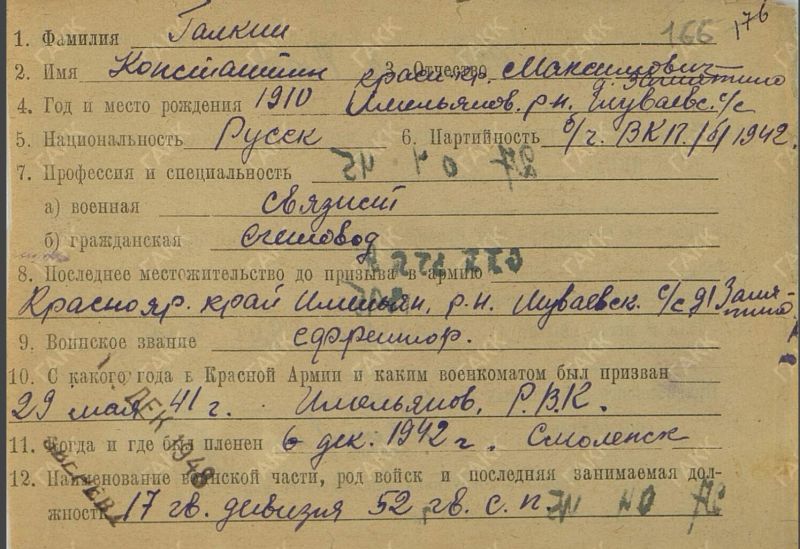 Галкин Константин Максимович, 1910 г. р. Место рождения Красноярский край, Емельяновский район, д. Замятино. Счетовод.Призван Емельяновским РВК в 1941 году. Член ВКП б с 1942 года. Ефрейтор. Телефонист. В/ч 52 гв сп 17 гв сд.Пропал без вести 7.12.1942 года. Смоленская область, Бельский район, д. Романово. ЖИВ. Попал в плен 6.12.1942 года в районе г. Смоленск. Лагерь для военнопленных находился в Германии, п. Рудов (район Берлина). Освобожден в апреле 1945 года. После проверки 30.04.1945 года выбыл в 241 озб. Жена Галкина Клавдия.