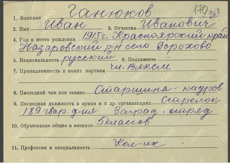 Ганюков Иван Иванович, 1915 г. р. Место рождения Красноярский край, Назаровский район, с. Дорохово. Призван Назаровским РВК в 1941 году. Старшина. Стрелок. В/ч 189 азо ( армейский заградительный отряд). Попал в плен 20.06.1942 года. Ростовская область, г. Новошахтинск. Освобожден в феврале 1943 года. Прошел проверку 13.05.1943 года. Документов о нем на сайте Память народа нет. Дальнейшая судьба не известна.