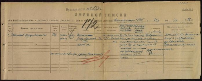 21.08.1942 года был ранен. Слепое осколочное ранение левой стопы с ожогами II и III ст. Перелом ключевой кости. Газовая флегмона стопы и голени.