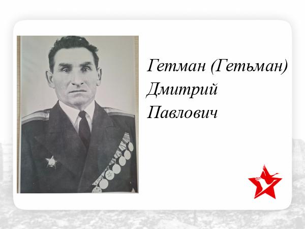Мой дед Гетман Дмитрий Павлович родился в большой многодетной семье в селе Васильевка Белгородская область Ракитянского района. Во время войны все (мужчины) ушли на фронт, вернулся с войны только брат Александр. А сестра Мария помогала фронту в тылу.