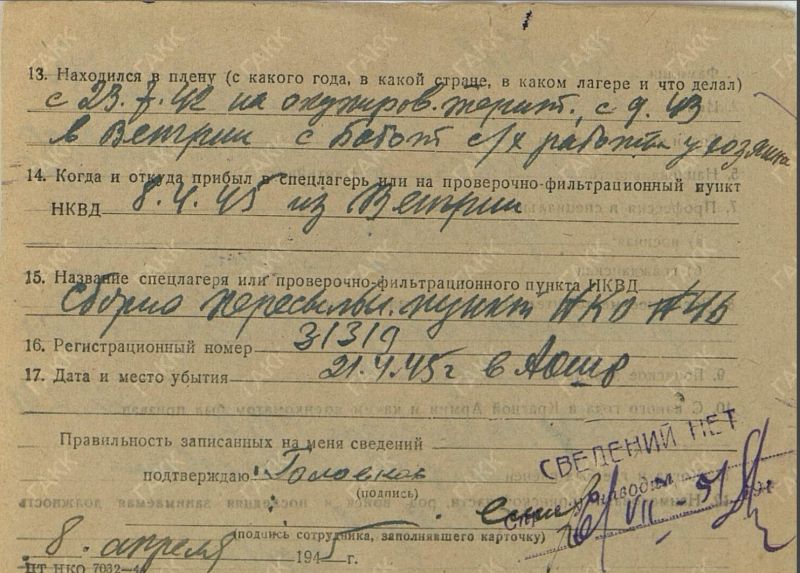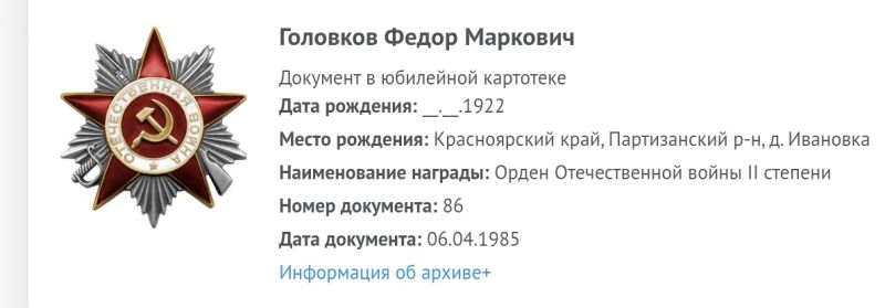 Головков Федор Маркович, 1922 г. р. Место рождения Красноярский край, Партизанский район, д. Ивановка. Призван Партизанским РВК в 1941 году. Красноармеец. Ездовой. В/ч 799 сп 228 сд. Попал в плен 23.07.1942 года под Ростовом. С 1943 года находился в Венгрии. Освобожден 8.04.1945 года. После проверки выбыл 21.04.1945 года в аошр. Награждён юбилейным орденом Отечественной войны 2 степени.