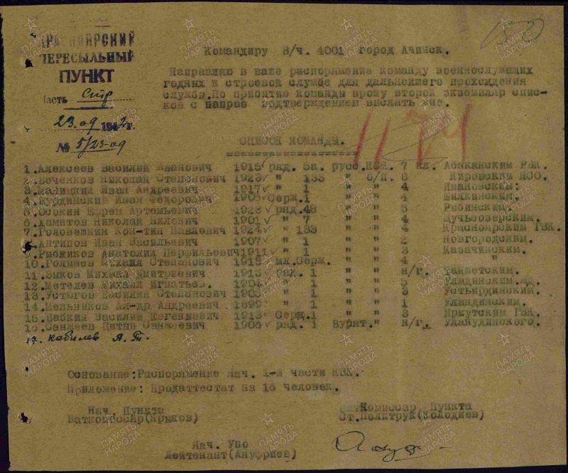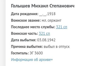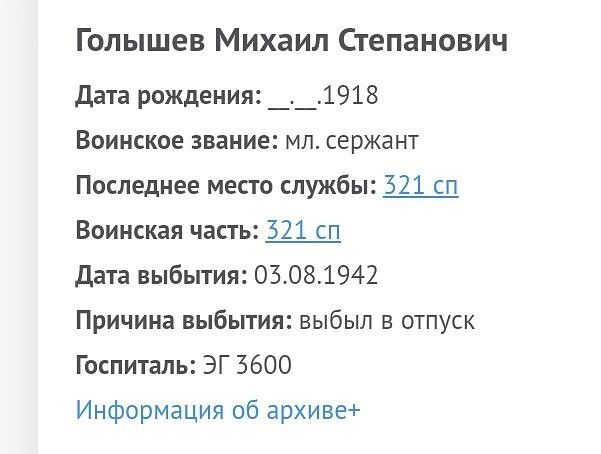 Голышев Михаил Степанович, 1918 г. р. Место рождения Красноярский край, Казачинский район, д. Мокруша. Призван Казачинским РВК в 1939 году. Мл. сержант. Командир отделения. В/ч 817 сп 239 сд., 303 сд., 321 сп 15 сд. Пропал без вести. ЖИВ. Ранен. Попал в плен в 1941 году в г. Сталиногорск (ныне Новомосковск, Тульская область). Освобождён в декабре 1941 года. Проверку прошел 11.02.1942 года. Эвакуирован в тыл, ЭГ 3600 (по справочнику Солдат. ру Казахстан, Актюбинская область, Алга). После излечения выбыл в отпуск 3.08.1942 года. Повторно призван Казачинским РВК в сентябре 1942 года. По данным Книги Памяти по Красноярскому краю погиб на фронте. Отец Голышев Степан Иванович.