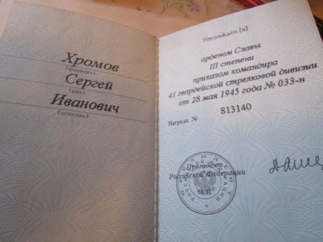 Хромов Сергей Иванович родился 10 мая 1925г. в д. Тюрюшля Стерлитамакского района Башкирской АССР. Призван на фронт в ноябре 1943г. Воевал в рядах Украинского фронта. Был стрелком. В ходе боев два раза был ранен в ногу. Учавствовал в освобождении Вены и Будапешта, за что был награжден медалями. Также был награжден орденом Славы III степени приказом командира 41 гвардейской стрелковой дивизии от 28 мая 1945г, медалью "За победу над Германией в Великой Отечественной войне 1941-1945гг." После войны жил в г. Стерлитамак, работал на заводе "Авангард". Умер 12 апреля 2013г.