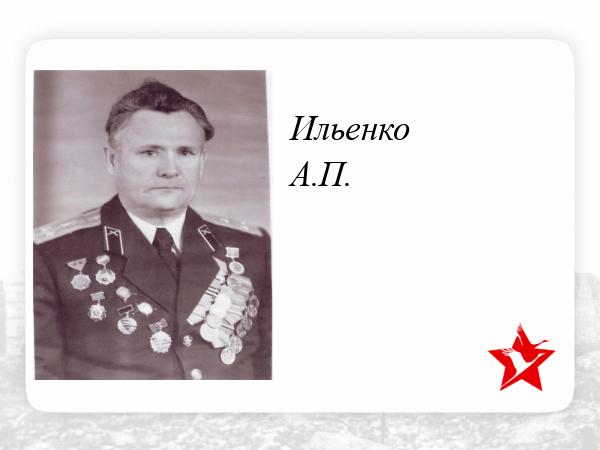 (1922г-2012г). В 19 лет ушёл на фронт. Ленинград, Прибалтика, Дальний Восток, Монголия, Маньчжурия, Япония - его боевой путь. Стал кадровым военным. Награждён медалями и орденами