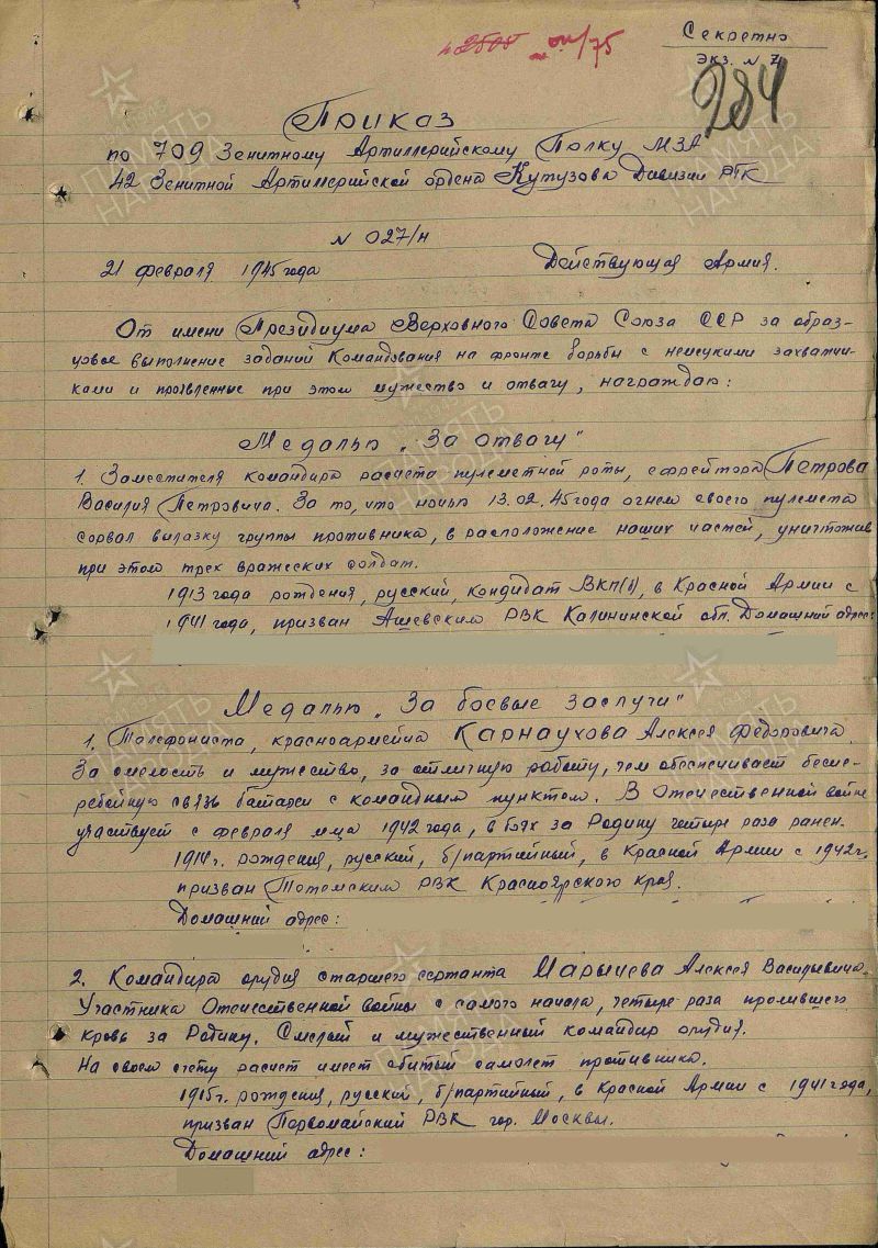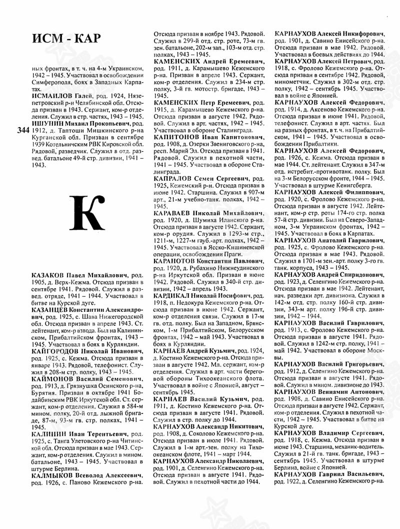 Карнаухов Алексей Фёдорович, 1914 г. р. Место рождения Красноярский край, Кежемский район, д. Аксеново. Призван Кежемским РВК в 1941 году. Красноармеец. Телефонист. В/ч 709 зенап МЗА 42 зенад РГК ЛенФ. Ранен 4 раза. ЭГ 2991 Литва, Каунас. Награждён медалью За боевые заслуги, медалью За Победу над Германией в Великой Отечественной войне 1941-1945 гг.