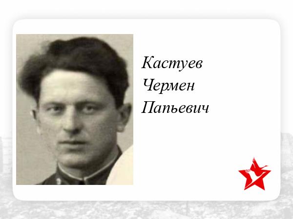 Старший лейтенант КАСТУЕВ ЧЕРМЕН ПАПЬЕВИЧ, 15.12.1912 года рождения, место рождения - РОССИЙСКАЯ ИМПЕРИЯ, Терская область, Владикавказский округ, Санибанское сельское правление, село Саниба (Горная Саниба): по административному делению: 1. СССР: РСФСР, Северо-Осетинская АССР), Гизельдонский район, Старо-Санибанское сельское поселение, село Старая Саниба; 2. РОССИИ: Республика Северная Осетия - Алания, Пригородный район, Кармадонское сельское поселение, село Старая Саниба), осетин. Год призыва в РККА: 11.1933. Образование: 1. Гражданское (общее): 6 классов школы (в ?г.); 2. Военное: Курсы младших лейтенантов при Бакинском пехотном училище имени Серго Орджоникидзе (в ?г.). В Великой Отечественной войне, с 22.06.1941 года, в должности (последняя): Офицера (без уточнения должности) 284 стрелкового полка, 86 стрелковой Казанской Краснознамённой дивизии имени Президиума Верховного Совета Татарской АССР, 10 Армии, Западного фронта. 30.07.1941 года, пленён: Белорусская ССР, Гродненская область, Волковысский район, в районе города Волковыск, в приграничных сражениях полка и дивизии. В плену (назвал: 1. Имя: Герман; 2. Отчество: Допович): Oflag 62 (XIII D) Хаммельбург (Hammelburg), военный округ XIII – Нюрнберг (Nürnberg), Бавария (Bayern), Третий Рейх (Das Dritte Reich); в н. вр.: г. Хаммельбург (Hammelburg), район Бад-Киссинген (Bad Kissingen), административный округ Нижняя Франкония (Unterfranken), федеральная земля Бавария (Bayern), ФРГ (Bundesrepublik Deutschland), лагерный №269. Совершил два, неудачных, побега, из плена: 17.11.1942, 19.05.1943. Убит, при попытке к третьему побегу, 14.11.1943 года. Захоронен: неизвестно. Родственники: Северо - Осетинская АССР, Алдонский район, деревня Фиагдон?, брат - Кастуев Борис.