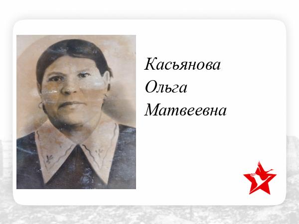 Касьянова Ольга Матвеевна (11.07.1915-03.12.2003) родилась в селе Старо-Корсаковский Майдан Кадошкинского района. Во время войны работала в колхозе «Красный выборжец», воспитывала двоих детей. В колхозе в основном работали женщины и дети. Они сеяли и убирали хлеб, картофель, кормовую свеклу, заготавливали сено для скота. Работали за трудодни. Военные годы выдались неурожайными, поэтому на полях они собирали колоски и мерзлую картошку. Хлеб пекли наполовину с крапивой, за дровами на санках ходили в лес. Но они выстояли! После войны у нее родились еще двое детей. Касьянова Ольга Матвеевна внесла свой вклад в победу над врагом и мирное небо над головой,