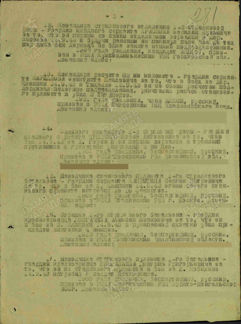 Кириллов Феоктист Павлович, 1921 г. р. Место рождения Красноярский край, Енисейский район, д. Колмогорово. Призван Енисейским РВК в 1940 году. Гв. ст. сержант. Командир расчета миномета. В/ч 279 гв. сп 91 гв. сд. Награжден медалью За отвагу (29.09.1943). Убит в бою 11.11.1943 года. Похоронен Беларусь. Витебская область. Лиозненский район, д. Ковалево.