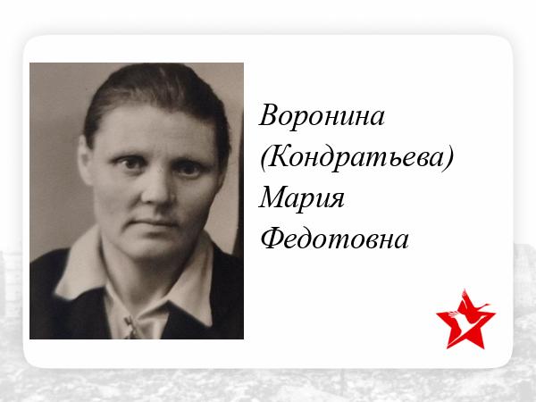 После войны она продолжала показывать высокие результаты в обслуживании телефонной линии. В апреле 1946 года Мария Федотовна отличилась в обслуживании телефонной связью выборов в Верховный Совет СССР. В том же 1946 году Мария Федотовна выходит замуж за героя войны Федора Михайловича Воронина и переезжает вместе с ним в Стерлитамак. В 1947 году появилась на свет старшая дочь Зоя. В 1950-х годы Мария Федотовна работала на заводе “Красный Пролетарий”, а именно кассиром заводского клуба. В 1960-е годы на том же заводе работала маляром, чистильщиком и кочегаром, успешно справляясь с такими непростыми специальностями. В 1971 году вышла на пенсию. Все знали Марию Федотовну как очень доброго и отзывчевого человека, который всегда выслушает и поможет. Замечательная мать, она всегда была лучшим другом своих дочерей. Мария Федотовна была членом КПСС, довольно часто выступая в заводском клубе. Мария Федотовна активно участвовала вместе со своим мужем Федором Михайловичем в памятных мероприятиях Великой Отечественной войны, в частности мероприятиях посвещенных боевому пути 4-й гвардейской армии в рядах которой сражался ее муж. Таким светлым, трудолюбивым, бескорыстным и патриотичным человеком была Мария Федотовна. Вечная ей память и слава!