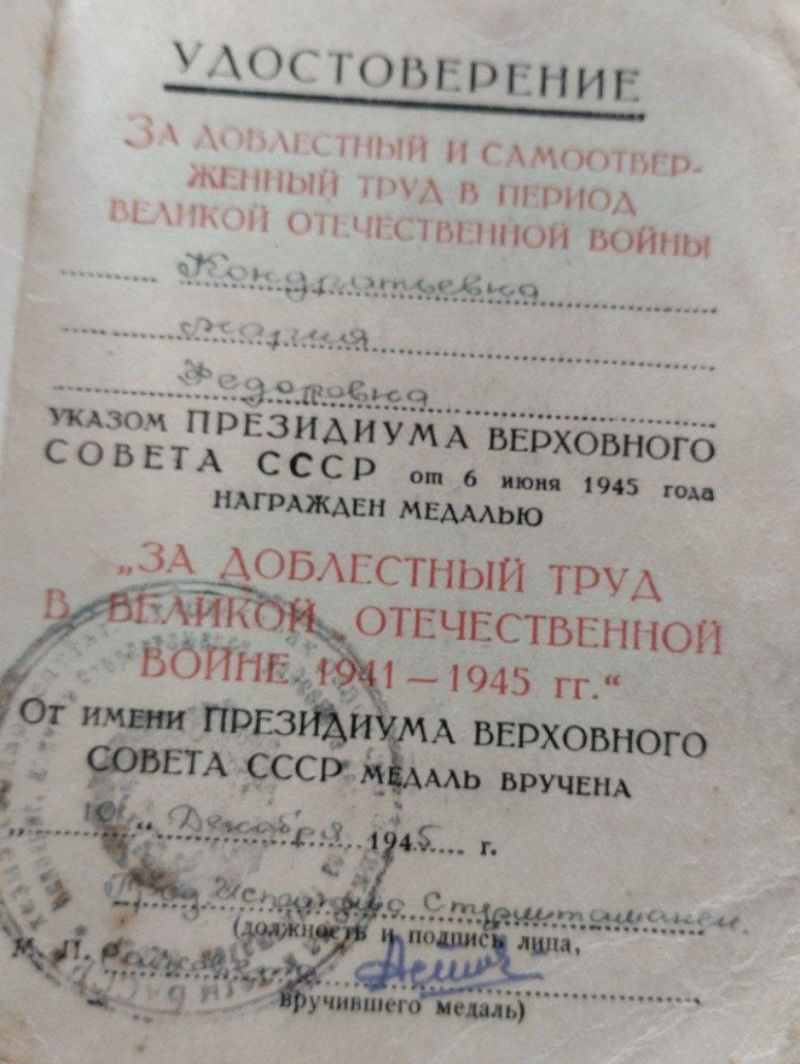 В 1941 году началась Великая Отечественная война, братья Марии Федотовны, Михаил и Тимофей были призваны на фронт. По телефонам всей страны стали проходить сведения военного характера и ряд государтсвенных тайн. Мария была настоящей патриоткой, и выполнила свои обязанности достойно. На протяжении всех военных лет она вовремя передавала сведения особой важности и исправно обслуживала телефонные линии. В ноябре 1945 года за хорошее обслуживание телефонной связи по Айгулевскому отделению связи, была награждена почетной грамотой. А 10 декабря 1945 года за самоотверженный труд была награждена медалью “За доблестный труд в Великой Отечественной войне 1941-1945”.