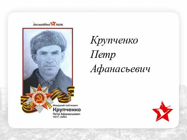 Крупченко Петр Афанасьевич родился в 1917 году в Оренбурской области 12 июня .Призвался в армию в 1938 году .На момент окончания службы началась Великая Отечественная война .Служил в танковых войсках .Был ранен ,контужен ,родным была даже отправлена похоронка .Имеет медали за взятие Берлина и Вены .После окончания ВОВ был отправлен воевать на Дальний Восток с Японией .Войну окончил в звании младший лейтенант в 1946 году.После Войны работал в колхозе .Умер в 2004 году.