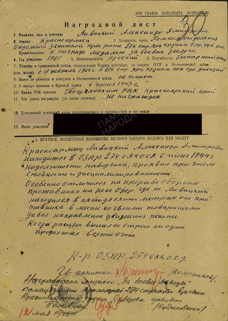 Левицкий Александр Дмитриевич, 1925 г. р. Место рождения Красноярский край, Богучанский район, д. Пинчуга. Призван Богучанским РВК в 1943 году. Красноармеец. Помощник командира отделения. В/ч озпр 274 сд. Участник штурма Берлина. Награжден медалью За боевые заслуги, медалью За Победу над Германией в Великой Отечественной войне 1941-1945 гг. Дата окончания службы 1949 год. Погиб в 1965 году.