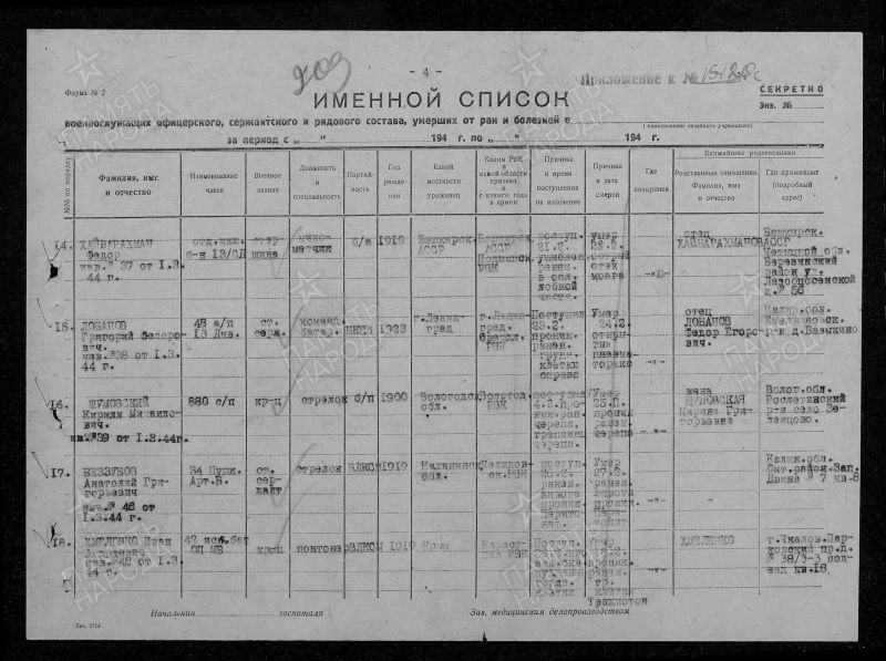 Лобанов Григорий Федорович. Воинское звание: ст. сержант. Последнее место службы: 48 сп. Дата выбытия: 26.02.1944 (захоронен) Причина выбытия: умер Госпиталь: ЭГ 924
