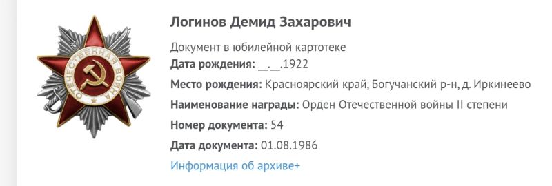 Логинов Демид Захарович, 1922 г. р. Место рождения Красноярский край, Богучанский район, д. Иркинеево. Призван Богучанским РВК в 1942 году. Красноармеец. Стрелок. В/ч 669 ап 229 сд. Попал в плен 21.07.1942 года на р. Терек. Лагерь для военнопленных находился в Восточной Пруссии. Освобожден в марте 1945 года. Выбыл после проверки 3.04.1945 в 197 азсп. Пропал без вести 30.04.1945 года в Германии. Извещение о смерти выслано матери 15.05.1945 года. ЖИВ. Участник штурма Берлина. Гв. сержант. Командир пулемётной роты. В/ч 160 гв. сп 54 гв. сд. Награждён медалью За взятие Берлина (25.01.1946), юбилейным орденом Отечественной войны 2 степени. Мать Логинова Прасковья Семеновна.