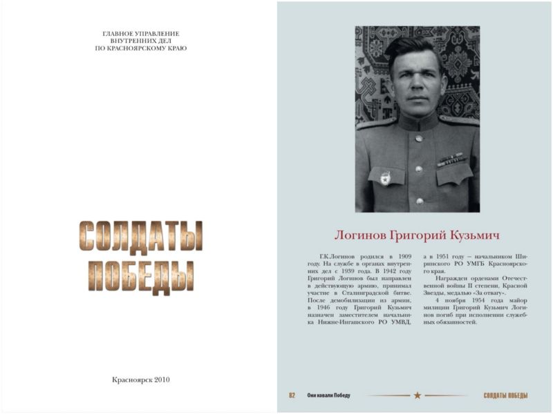 Логинов Григорий Кузьмич, 1909 г. р. Место рождения Красноярский край, Богучанский район, д. Бедоба. Призван в ряды РККА Красноярским ГВК в 1936 году. Член ВКП б с 1939 года. Сержант ГБ/гв. капитан. Оперуполномоченный ОК СМЕРШ. В/ч 308 сд., 310 гв. ап 120 гв. сд. Участник Сталинградской битвы. Награждён медалью За отвагу, медалью За оборону Сталинграда, орденом Красной Звезды, орденом Отечественной войны 2 степени, медалью За Победу над Германией в Великой Отечественной войне 1941-1945 гг., медалью За боевые заслуги.