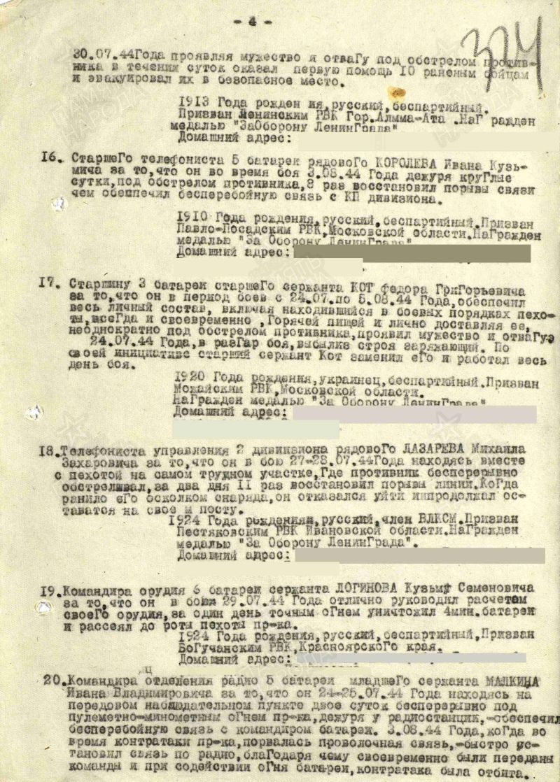 Логинов Кузьма Семёнович, 1924 г. р. Место рождения Красноярский край, Богучанский район, д. Иркинеево. Призван Богучанским РВК в 1942 году. Сержант. Командир орудия. В/ч 1300 гап 58 габр 18 адп РГК. Награждён медалью За оборону Ленинграда, медалью За отвагу, медалью За Победу над Германией в Великой Отечественной войне 1941-1945 гг., юбилейным орденом Отечественной войны 1 степени. Мать Логинова Мария Михайловна.