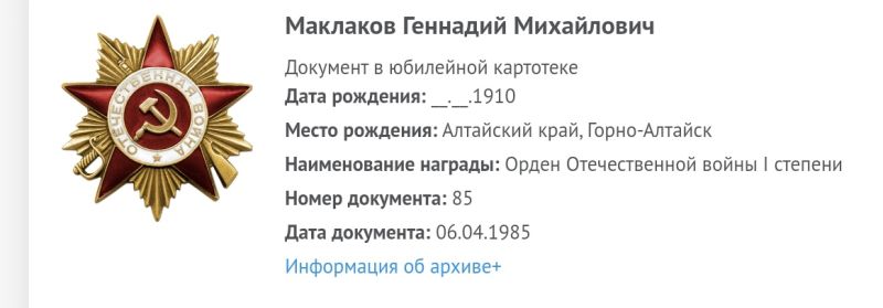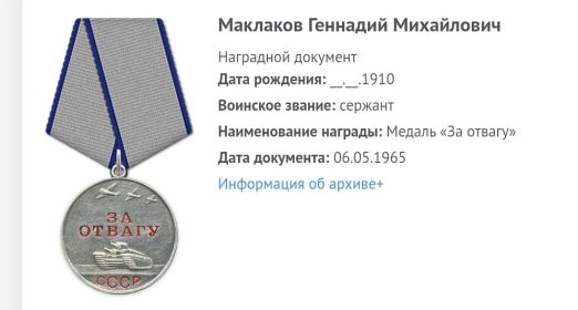 Маклаков Геннадий Михайлович, 1910 г. р. Место рождения Алтайский край, г. Горно-Алтайск. До войны жил в Красноярском крае, Богучанский район, д. Иркинеево. Призван Богучанским РВК в 1942 году. Сержант. Стрелок. В/ч 918 сп 250 сд. Тяжело ранен в декабре 1943 года. ЭГ 2100 ( по справочнику Солдат. ру дислокация г. Орел), 2828 (Горьковская область, Балахна). Награждён медалью За отвагу ( приказ от 6.05.1965), юбилейным орденом Отечественной войны 1 степени. К истории прилагается письмо брата, Маклакова Павла Петровича, 1906 г. р., пропавшего без вести в 1944 году.
