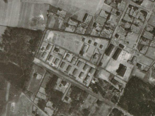 "Stalag Luft II Лодзь «Лицманнштадт» (Lodz «Litzmannstadt»). Аэрофотоснимок лагеря Stalag Luft II, май 1942 года.";