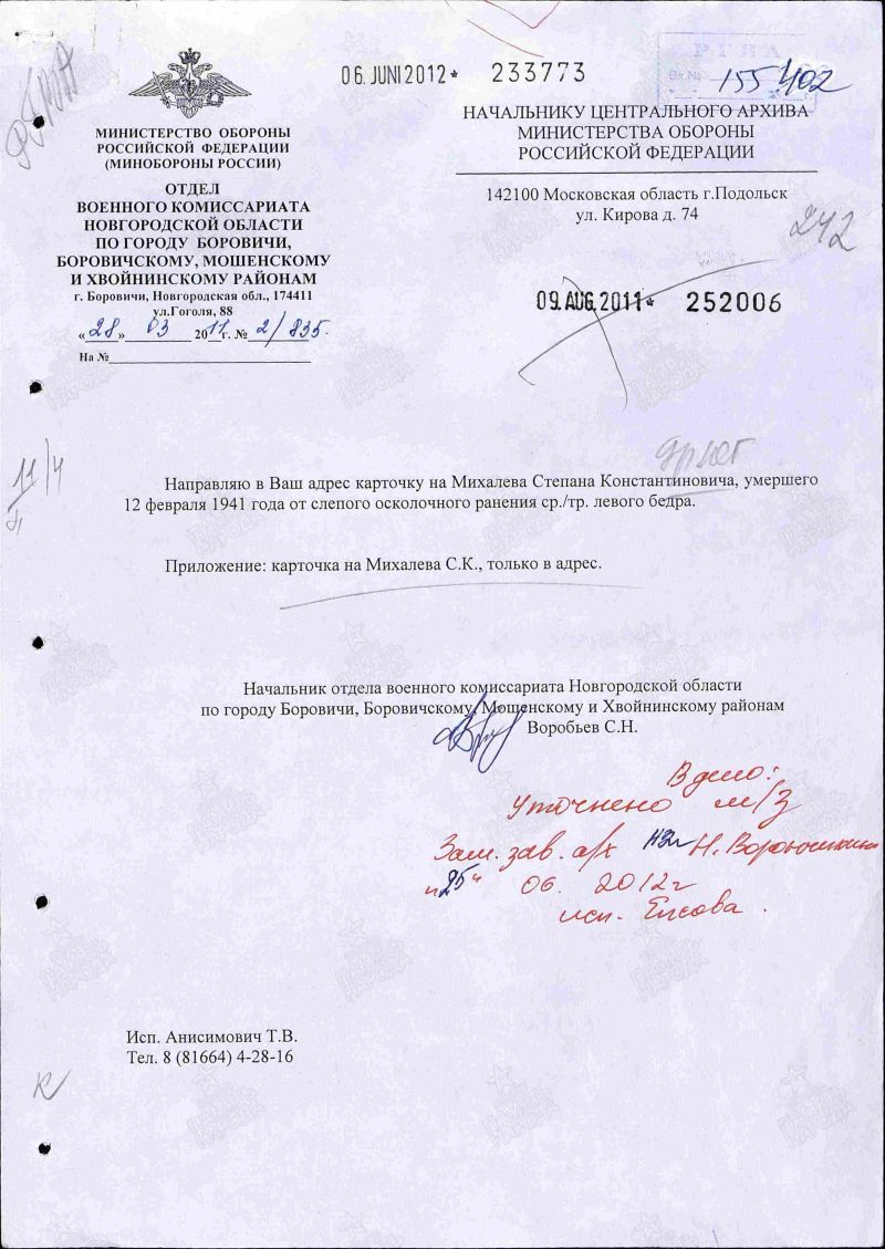 Михалев Степан Константинович, 1908 г. р. Место рождения Красноярский край, Удерейский(ныне Мотыгинский) район, Рыбинский с/с, д. Пашино. Призван Удерейским РВК в сен1941 года. Красноармеец. Стрелок. В/ч 56 сп 67 сд. Умер от ран 12.02.1942 года в ЭГ 2747. Похоронен Ленинградская (ныне Новгородская) область, г. Боровичи. Отец Михалев Константин Иванович.