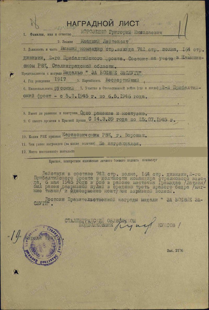 Григорий Николаевич родился в г.Камышин. В Красной Армии с 14.03.1939 года по 25.07.1945 г.Призван был Кагановичским РВК г.Воронеж, учился там в институте. Награжден медалью "За боевые заслуги". Из наградного листа: " Действуя в составе 742 стр.полка, 164 стр.дивизии, 2-го Прибалтийского фронта в должности командира стрелкового взвода, 6 мая 1945 года в бою в районе местечка Грамздас (Латвия), был ранен разрывной пулей в среднюю треть правого бедра (мягкие ткани) и одновременно контужен взрывной волной". Раненую ногу позже ампутировали.