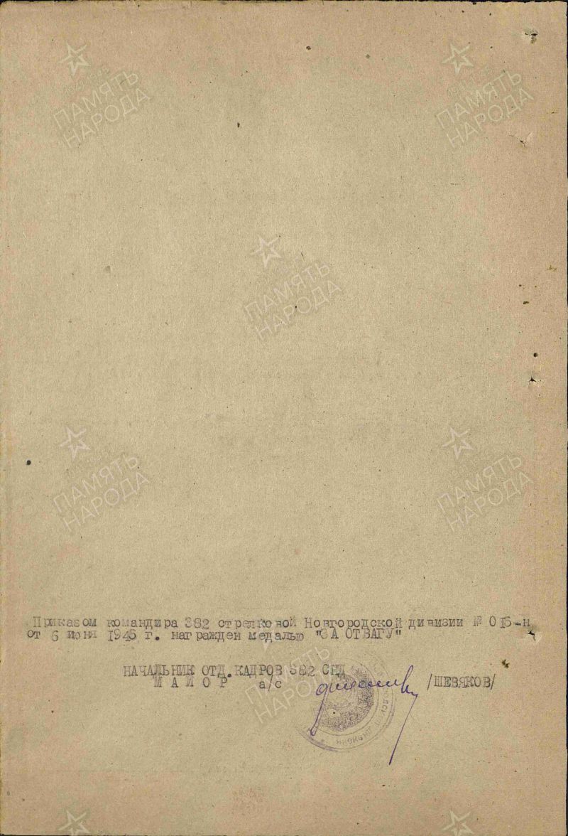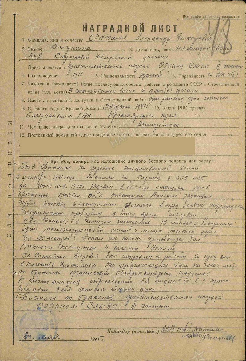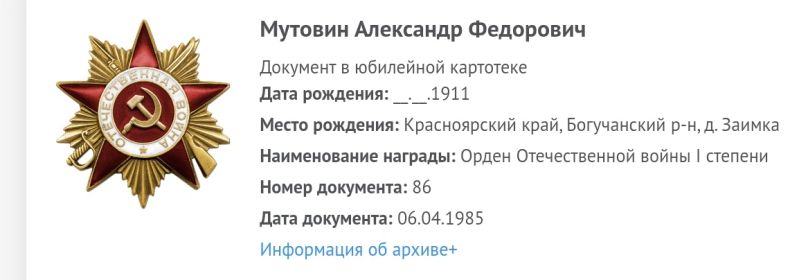 Мутовин Александр Фёдорович, 1911 г. р. Место рождения Красноярский край, Богучанский район, д. Заимка. Член ВКП б. Призван Богучанским РВК в 1941 году. Старшина. Сапер. В/ч 663 отд. саперный батальон 382 сд., где воевал с родным братом Мутовиным Николаем Федоровичем. При выходе из окружения 2Уд. А. был тяжело ранен и контужен. После излечения продолжил службу заведующим продовольственным складом. Награждён медалью За отвагу, юбилейным орденом Отечественной войны 1 степени. В наградном листе допущена ошибка в ФИО- Брюханов Александр Захарович, которая исправлена при оцифровке документов на сайте Память народа.