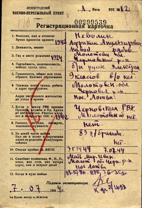 Африкан Апполинарьевич был самым старшим в большой семье, попал на фронт в юном возрасте,он прибавил свой настоящий возраст , что бы поскорее отправиться на фронт, и встать на защиту родины. Он попал пол Сталинград в 1942 году, начинал простым пехотинцем, после чего перешел в разведку. Был тяжело ранен в 1943 году, в районе г. Орла и находился в госпитале до сентября 1944 года. В 1945 году, Африкан Апполинарьевич был переброшен на восточный фронт , встречал победу в Кениксберге. 12 мая отряд под его командованием попал в засаду , Африкан А. получил тяжелое ранение, и до конца 1945 года находился в госпитале, в городе Сочи, после чего его отправили в действующую часть на территории Западной Украины, где он занимался уничтожением бандеровцев. После этого он попал в Грознинскую область, где встретил свою будущую супругу, Анну Петровну Даронину. После войны Африкан Апполинарьевич и Анна Петровна поженились, и уехали на Урал, трудились и жили в поселке Майкор.