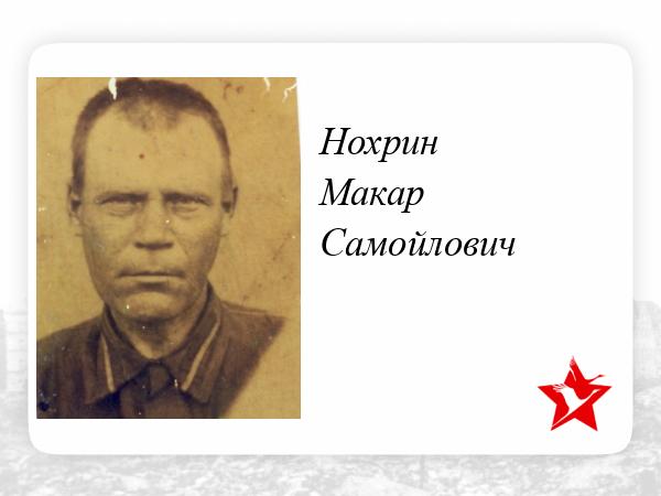 Мой дед Нохрин Макар Самойлович родился и жил в д. Кукушки Исетского района Тюменской области (тогда это была Омская область). В 1941 г. он ушёл на фронт. Воевал Макар Самойлович в 154 Гвардейском артиллерийском полку СД 7-ой армии Белорусского фронта. В приказе о награждении Нохрина М. С. от 27. 05. 1944 г. говорится: " Гвардии ефрейтор Нохрин М. С. 10.07.1943 г. при прорыве обороны противника в районе Толкачёво Орловской области, под огнём противника, доставлял боеприпасы на огневую позицию, чем способствовал выполнению боевого приказа". За этот бой Макар Самойлович был удостоен награды медалью "За отвагу". 26. 07. 1943 г. в районе Белый Колодец Орловской области, под разрывами мин и снарядов противника Нохрин М. С. своевременно доставлял боеприпасы на огневую позицию, что позволило вести бесперебойный огонь по противнику. В этот же день он и погиб, в очередной раз подвозя боеприпасы на позицию под непрерывным огнём фашистов.