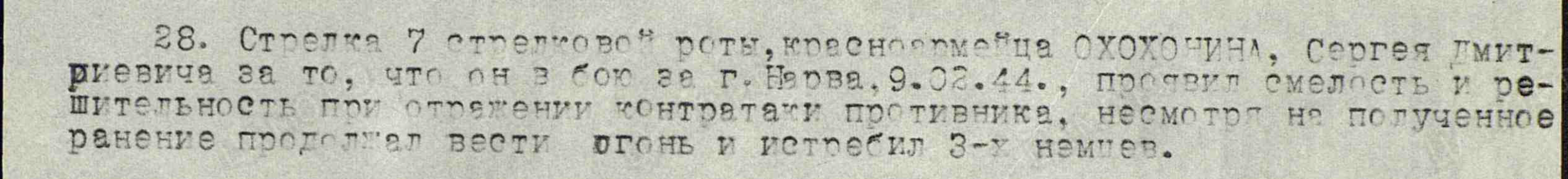 В бою за г. Нарва 9.02.44 г. проявил решительность при отражении контратаки противника, несмотря на ранение, продолжал вести огонь и истребил трёх немцев.