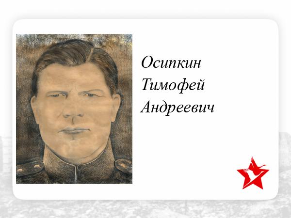 О жизни моего прапрадедушки рассказала мне моя бабушка. Прапрадедушку звали Осипкин Тимофей Андреевич. Родился он в 1905 году, в большой крестьянской семье в селе Кулясово. В семье их былосемеро детей. С малых лет трудился. Было трудное, голодное время, работал в поле вместе с отцом. Помогал кормить семью. Окончил прапрадедвсего три класса. У самого прапрадедушки было пятеро детей. Когда началась Великая Отечественная война, прапрадеда на войну не брали, так как он был председателем совхоза. Ездил в район в Военкомат с просьбой, чтобы его отправили на фронт, а его не брали. И только в 19421 году тогда, когда с войны возвращались раненые, он подучил фронтовика с одной ногой. А сам ушел на фронт воевать. Прапрадедушка был командиром, прошел всю войну. Подошел к Латвии и в 10 октября 1944 году погиб в жестоком бою. За две недели до гибели увиделся с сыном. Он похоронен в Латвии, за могилой ухаживают. Я горжусь своим прапрадедом, который защищал Родину от захватчиков!