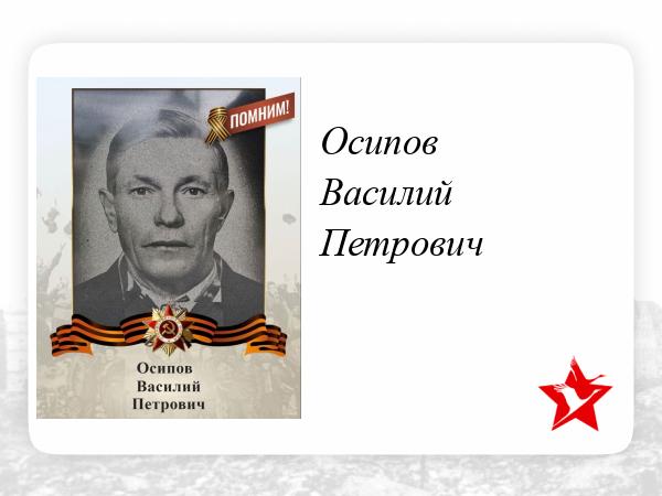 Мой дед , Василий Петрович Осипов 1925 г.р. Ветеран войны, призван в Советскую армию 18 ноября 1943 году в войска ПВО (противовоздушной обороны) стрелком, зенитной части п.в.о. в/ч 04598, в 1944 их часть попала под бомбовый удар фашисткой армии - был контужен но остался жив, попал в госпиталь затем 15 ноября 1944 был комиссован домой по состоянию здоровья. До победы он дожил и дожил до наших лет до 1990 года. Мы обещаем нести эту память через века, эту память нести с честью и достоинством и мы горды, что именно мы имеем честь называться - ВНУКАМИ ПОБЕДИТЕЛЕЙ ! Вечная память нашим ветеранам, вечная память советским войнам!