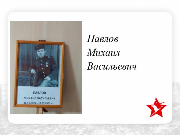 Павлов Михаил Васильевич, родился 25 ноября 1925 г. в селе Красная Поляна. Был призван 11 ноября 1942 г. Воевал на 2-м Украинском фронте маршала Малиновского. Был командиром отделения расчёта зенитно-артиллерийской установки. За время войны отделением было сбито 15 вражеских самолётов. Награждён Орденом Отечественной Войны 2 степени и 11 медалями, в т.ч медаль За отвагу. Освобождал Венгрию. Демобилизовался в 1951 г.