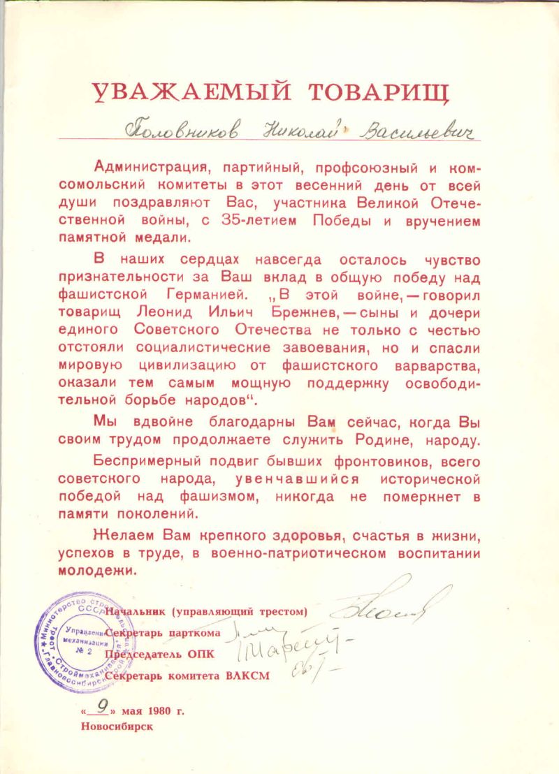 Дедушка был призван Новосибирским РВК в декабре 1941г. в 847 –й строевой полк .В октябре 1943 был переведен в артиллерийский полк-1096.С января 1945г по июнь 1945г. воевал в 72 отдельной зенитной артиллерийской дивизии. Он на тракторе подвозил боеприпасы и в июне 1945 г. был тяжело ранен и госпитализирован.Домой дедушка вернулся только в 1946г.Бабушка его дождалась , жизнь продолжалась ,они родили троих детей. Дети выросли и появились внуки , нас было пятеро, я самая любимая. К сожалению о боях и где воевал ,дедушка не любил рассказывать, не любил лишний раз надевать медали, по жизни был скромным ,удивительно добрым, любящим, самым замечательным отцом и дедушкой Имеет правительственную награду «За победу над Германией». Вообще у него много наград и я горжусь своим дедом! После войны дедушка работал в Управлении механизации ,его очень ценили и уважали на работе. Вся трудовая книжка исписана о поощрениях и награждениях: Четырежды «Заслуженный механизатор»,»Ударник социалистического труда», награжден нагрудным значком «Отличник социалистического соревнования»,награжден медалью «За трудовое отличие», и за добросовестный и долголетний труд был награжден медалью «Ветеран труда»,Дедушки давно нет с нами ,он ушел в марте 1991г.,но Он всегда рядом. В Новосибирске на ОбьГэсе , есть памятник ветеранам ВОВ и там вписана фамилия моего деда Половников Николай Васильевич.