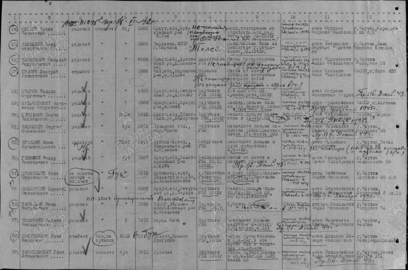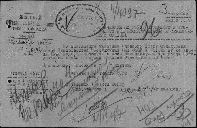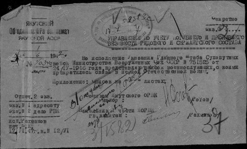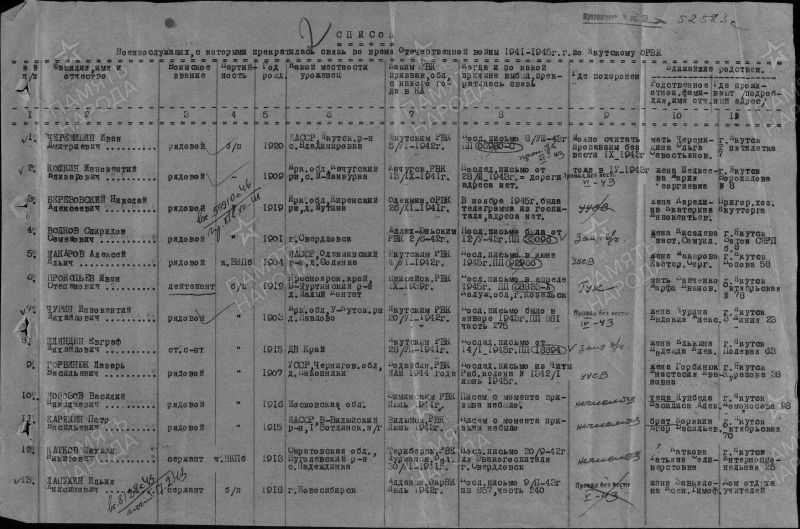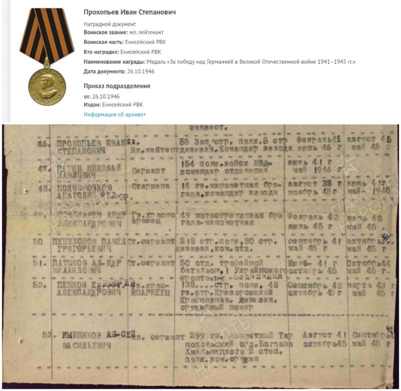 Прокопьев Иван Степанович, 1919 г. р. Место рождения Красноярский край, Большемуртинский район, д. Малый Кантат. До войны жил в Енисейском районе, г. Енисейск. Призван Енисейским РВК в 1939 году. Мл. лейтенант. Командир взвода. В/ч 55 зсп 5 зсд. Последнее письмо родные в апреле 1945 года. П/п 68833 подчиненность в/ч 5 зсд, Калужская область, г. Козельск. Признан пропавшим без вести в 1945 году. Срок окончания службы Прокопьева И. С. июнь 1946 года. Награждён медалью За Победу над Германией в Великой Отечественной войне 1941-1945 гг. Мать Зайченко Марфа Ивановна в 1947 году проживала в г. Якутск.