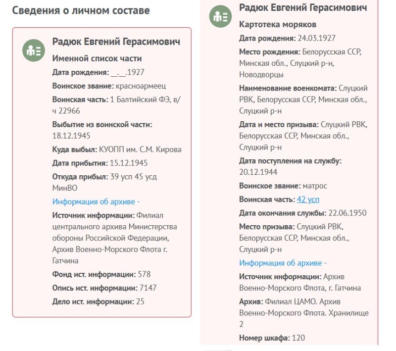 Однако не успели они вернуться домой, как Евгения, которому к тому времени уже исполнилось 17 лет, призвали на срочную службу. Случилось это 20 декабря 1944 года. Место призыва на срочную службу – Слуцкий РВК. Евгения Герасимовича Радюка призвали в 42-й учебный стрелковый полк 45 учебной стрелковой дивизии матросом. Так Женя из партизана превратился в красноармейца. Между 7 и 28 августа 1945 года его перенаправили в 38 учебный стрелковый полк. На сей раз его звание, прописанное в документах, рядовой. Матрос и рядовой – это аналогичные воинские звания, которые отличаются лишь принадлежностью военнослужащего либо к флоту, либо к пехоте. Поэтому вероятнее всего разница в документах связана только с тем, в каком ведомстве они были подготовлены.