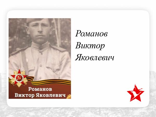 «... Оврадиотелеграмота 3-й батареи гвардии рядового Романова Виктора Яковлевича за то что он в период наступательных опера ии 18.08. 43 года в районе Деревкова со своей радиостан шей находился на командном пункте командира 2 батальона вост 2.2 км Деревово и под осполками вражеских мин и снарядов умело держал бес прерыв ную связь с командиром дивизи