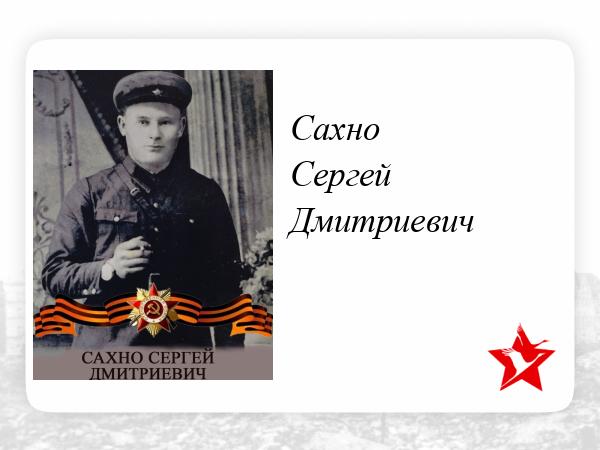 Сахно Сергей Дмитриевич - мой дедушка. Знаю со слов бабушки, что он родился на Украине. Приехал в молодые годы на Урал и поступил на учебу в ТУ г. Красноуфимска на помощника машиниста. В Локомотивном депо, помощником, дед проработал год. А в 1939 году, устроился поваром в дом отдыха Сарана. Дед познакомился с моей бабушкой, Токаревой Раисой Екимовной и постепенно завязалась у них дружба, а затем и переросла в любовь. Работа поваром деду пришлась по душе и в 1940 году, он прошел курсы поваров. Распределили его в г. Чад, Зав.производством. В этом же году, он переходит Зав. производством в ресторан Вокзал в г.Красноуфимске. Говорят, что готовил очень вкусно, что никак не передалось мне по наследству… Вскоре, Родилась старшая дочь - Надежда Сергеевна, а позднее бабушка снова ждала малыша… Но тут война… А тот малыш, это мой папа, родился 22 августа 1941 года. Дед с бабушкой расписались 20 сентября 1941 года - в день, когда деда призвали в ряды РККА, приказом №194. Моему папе в то время не исполнилось и месяца. Воевал дед в 19 механизированной бригаде первого механического корпуса. 19 декабря 1943 года Сергей Дмитриевич погиб. Погиб в день своего рождения. Долгие годы семья не знала место гибели , хотя искали, писали, обращались… Место удалось узнать только спустя много лет, когда уже не стало бабушки, а папа был уже далеко не молод и не мог посетить место гибели и захоронение отца. Это Кировоградская область, Новгородка, братская могила №255.