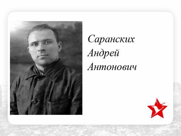Саранских Андрей Антонович, мой дедушка. Родился 24 августа 1911 года в деревне Покровка Лебяжьевского района Курганской области. К началу войны он с семьей проживал в городе Челябинске. Был труженником тыла. Очень много кто рассказывает о героях, которые на передовой сражались за нашу Родину. И почти никто не говорит о тех, кто эту победу ковал в тылу. В Челябинске во время войны было много металургических заводов, на которых выпускали снаряды, танки и другую военную технику.