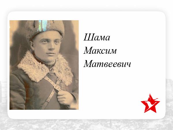 Шама Максим Матвеевич, моего дедушку помню добрейшим и самым близким человеком моего детства. Мальчишкой осиротел, родители умерли при голодоморе, в Ворошиловградской области. Приютили люди в деревне, кормили за помощь по хозяйству. Однажды поздно вечером увидел, как хулиганы прятали в сарае хозяев мешки, испугавшись что его заметили и убьют, сбежал на станцию, где попросил остаться у начальника станции. Призван в 1938 году.