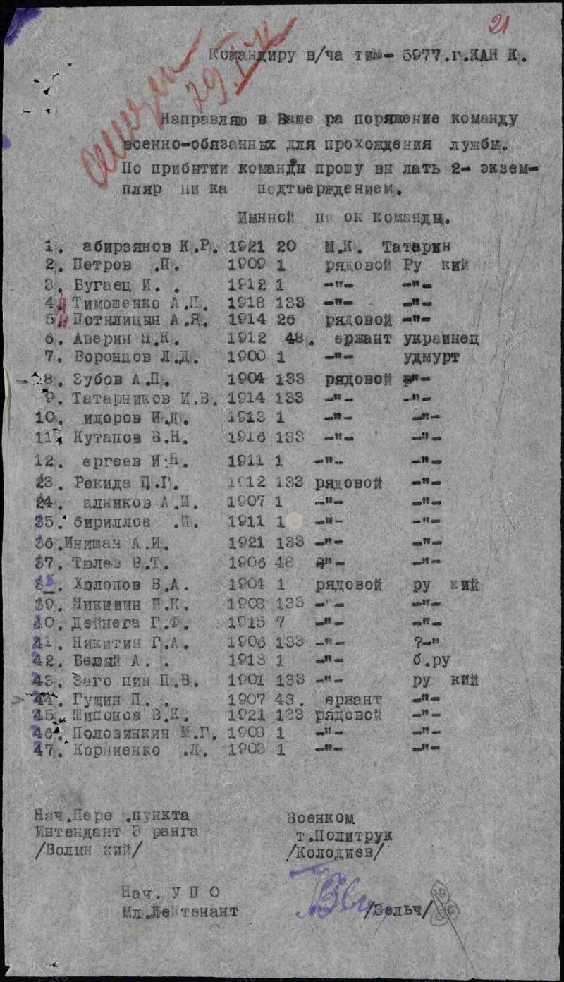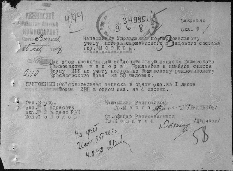 Шипунов Виктор Константинович, 1921 г. р. Место рождения Хабаровский край, г. Николаевск на Амуре. До войны жил в Красноярском крае, Кежемский район, с. Кежма. Призван Красноярским РВК в январе 1942 года. Сержант. Пулемётчик. Последнее письмо родные получили 12.03.1942 года из Канска. Пропал без вести в июне 1942 года. Мать Шипунова Ольга Герасимовна проживала в с. Кежма, школьный городок.
