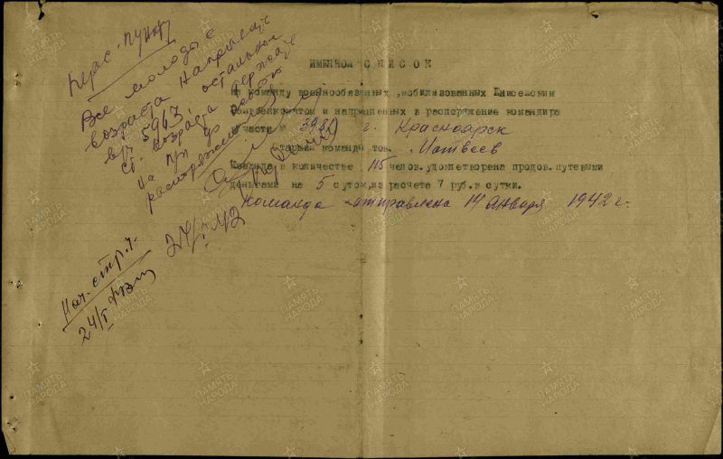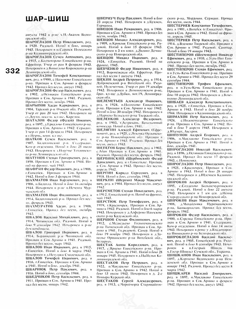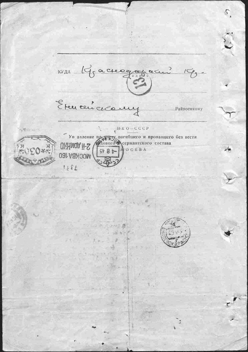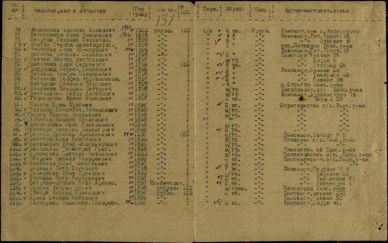 Шишканов Иван Васильевич, 1897 г. р. Место рождения Пензенская область, Вадинский район, д. Кортнево. До войны жил в Красноярском крае, Енисейский район, д. Подгорное. Призван Енисейским РВК в январе 1942 года. Последнее письмо родные получили 20.01.1942 года с дороги на фронт. Пропал без вести в марте 1942 года. Жена Шишканова Василиса Андреевна.